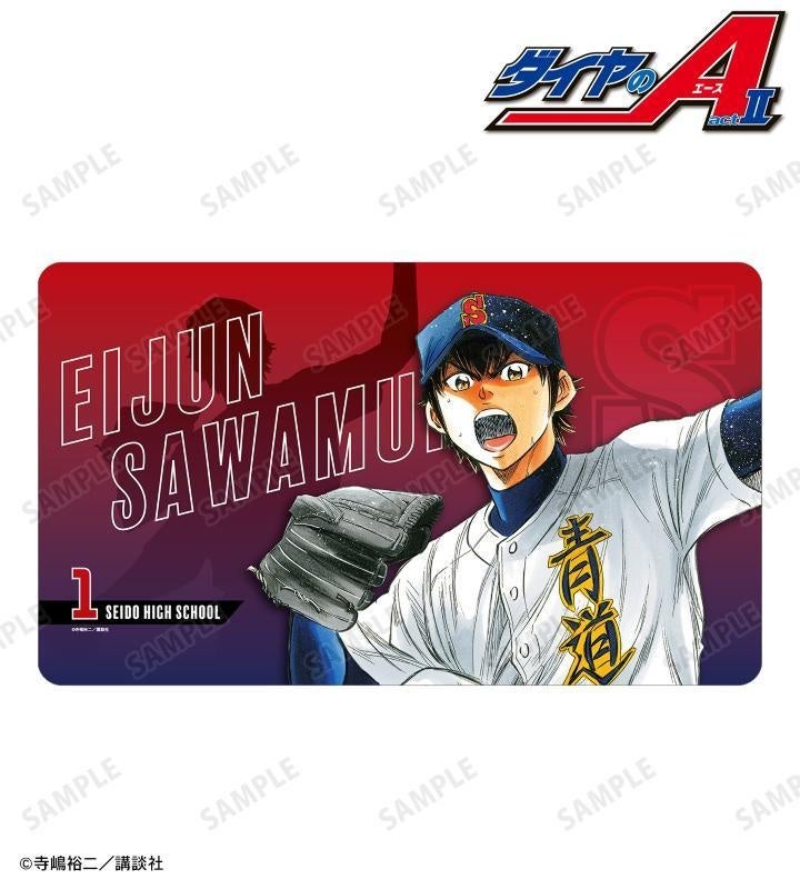 沢村栄純、御幸一也、降谷暁、倉持洋一、小湊春市の原作表紙イラスト、キャラクター名、背番号、学校名をマルチデスクマットに仕上げました。