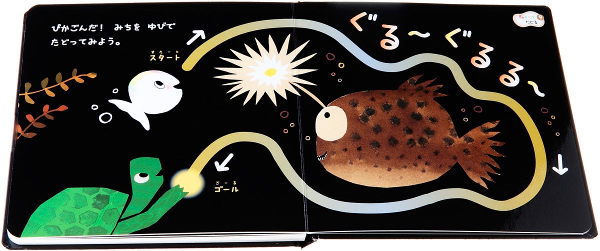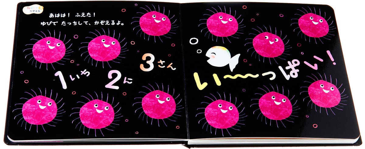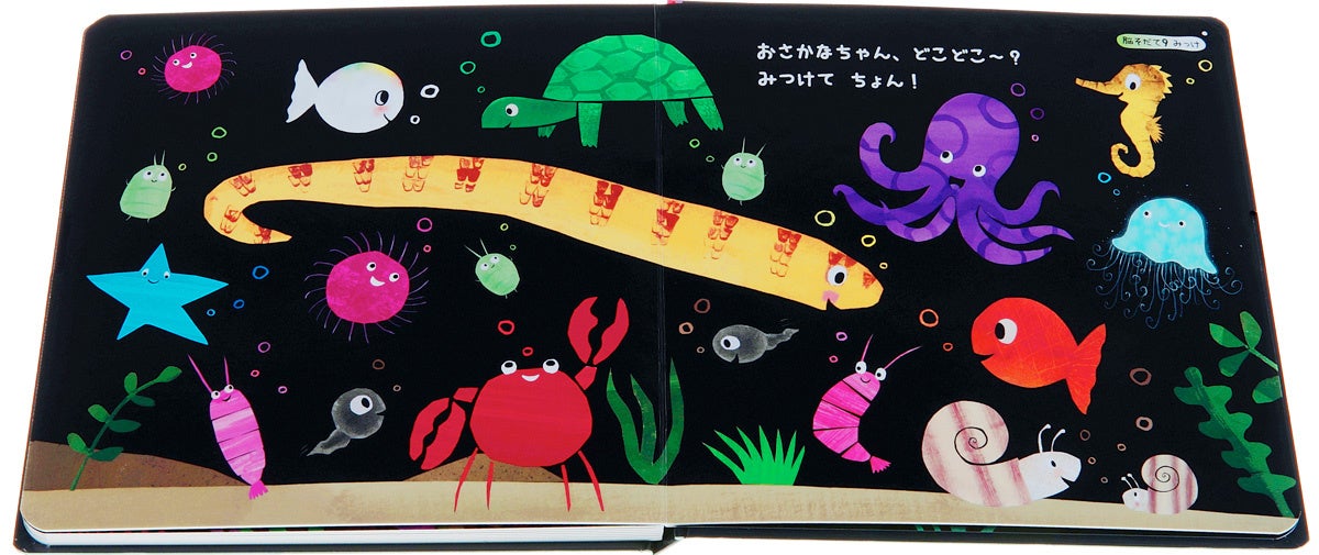 めくれば、ページいっぱいに広がる美しい黒い海。そこでくらすカラフルでゆかいな仲間たち…!