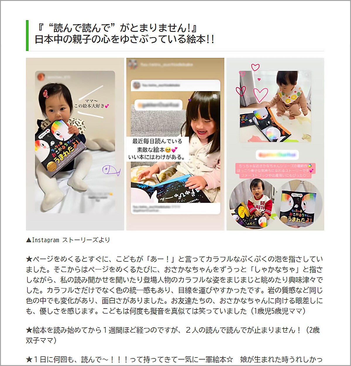 ▲シリーズの最新刊『ちっちゃなおさかなちゃん、うまれたよ!』のモニター報告をまとめた動画。こどもたちが絵本に夢中!