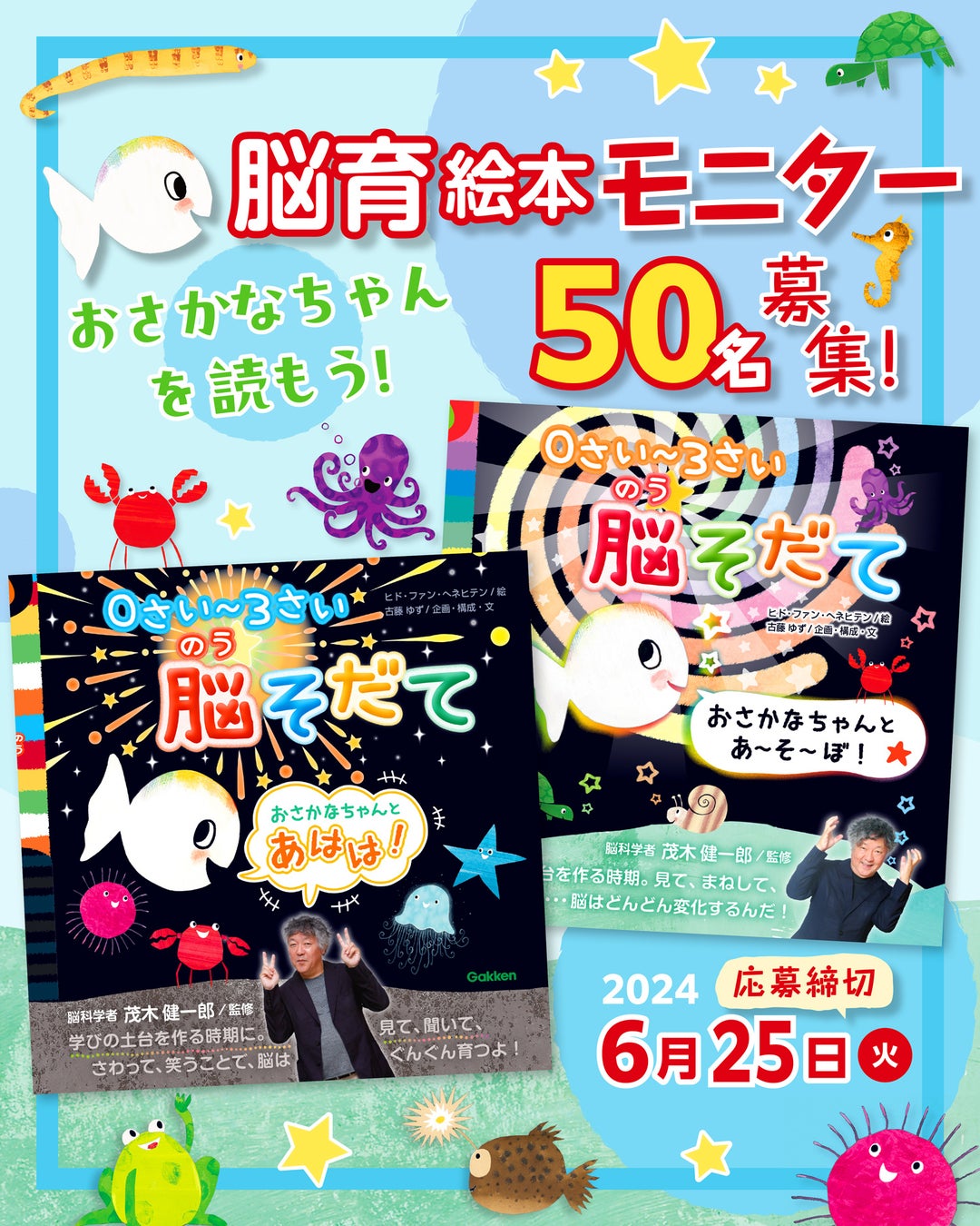 株式会社 学研ホールディングス(東京・品川/代表取締役社長:宮原博昭)のグループ会社、株式会社 Gakken(東京・品川/代表取締役社長:五郎丸 徹)は、脳育絵本『0さい~3さい脳そだて おさかなちゃんとあはは!』『0さい~3さい脳そだて おさかなちゃんとあ~そ~ぼ!』の増刷を記念し、2024年6月10日(月)よりモニター・キャンペーンをSNSにて開始いたしました。
