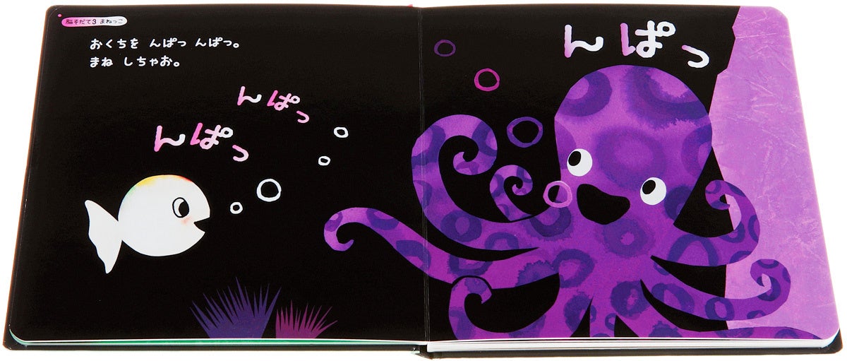 主人公のちいさな白いおさかなちゃんといっしょに、まねっこしたり、数えたり、なぞったり、見つけたり。楽しく遊びながら、脳を育てる内容です。