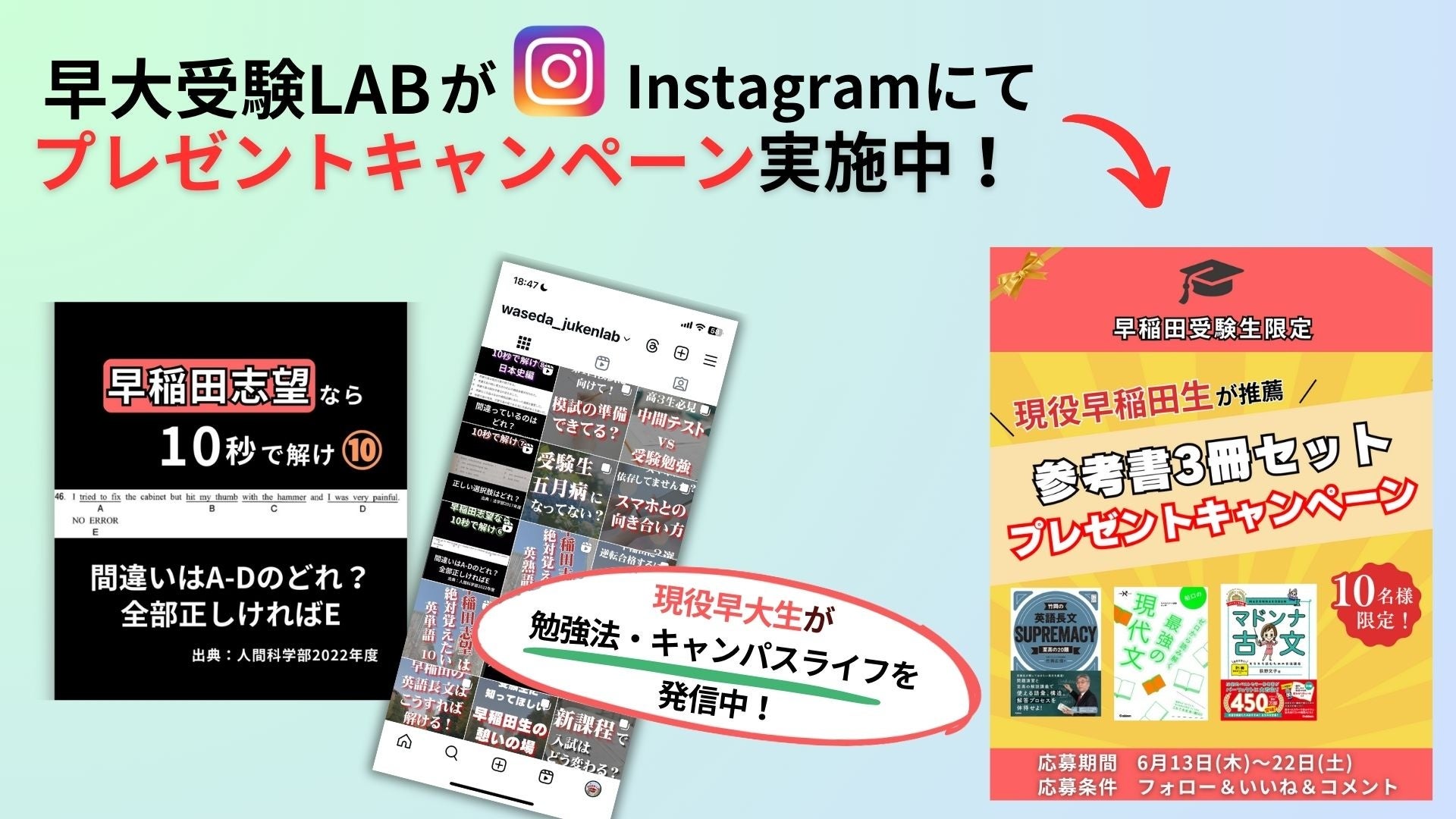 現役早稲田生が運営する受験生応援Instagramアカウント【早大受験LAB】が、受験生応援企画として「”現役早稲田生が厳選した”参考書3点セットプレゼントキャンペーン」を開催します!