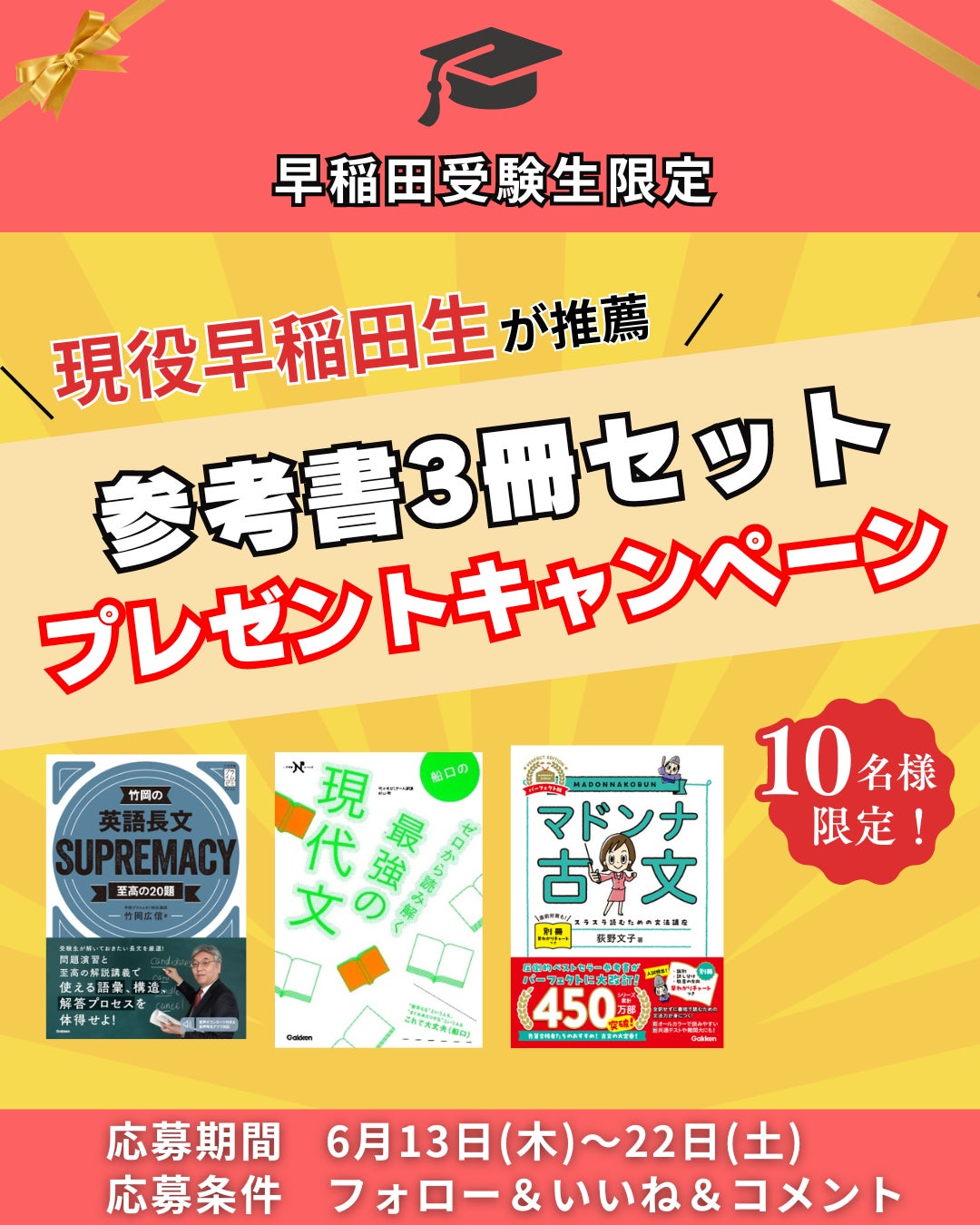 抽選で10名様に「”現役早稲田生が厳選した”参考書3点セット」が当たるプレゼントキャンペーン!