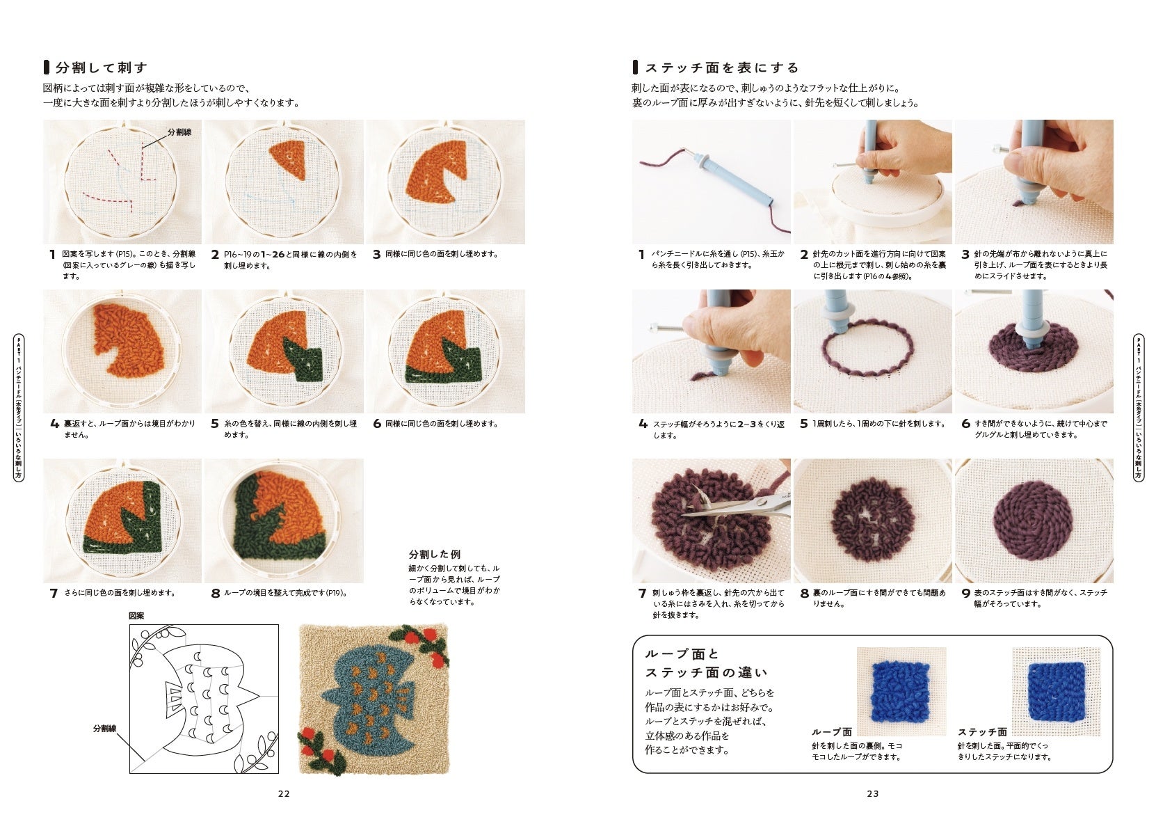 本書は太糸タイプと細糸タイプの2種類あるパンチニードルの基本をぎゅっと1冊にまとめました。基本の道具から、刺し方、布や糸の選び方、失敗しないコツなど、すべて写真付きで解説しています。