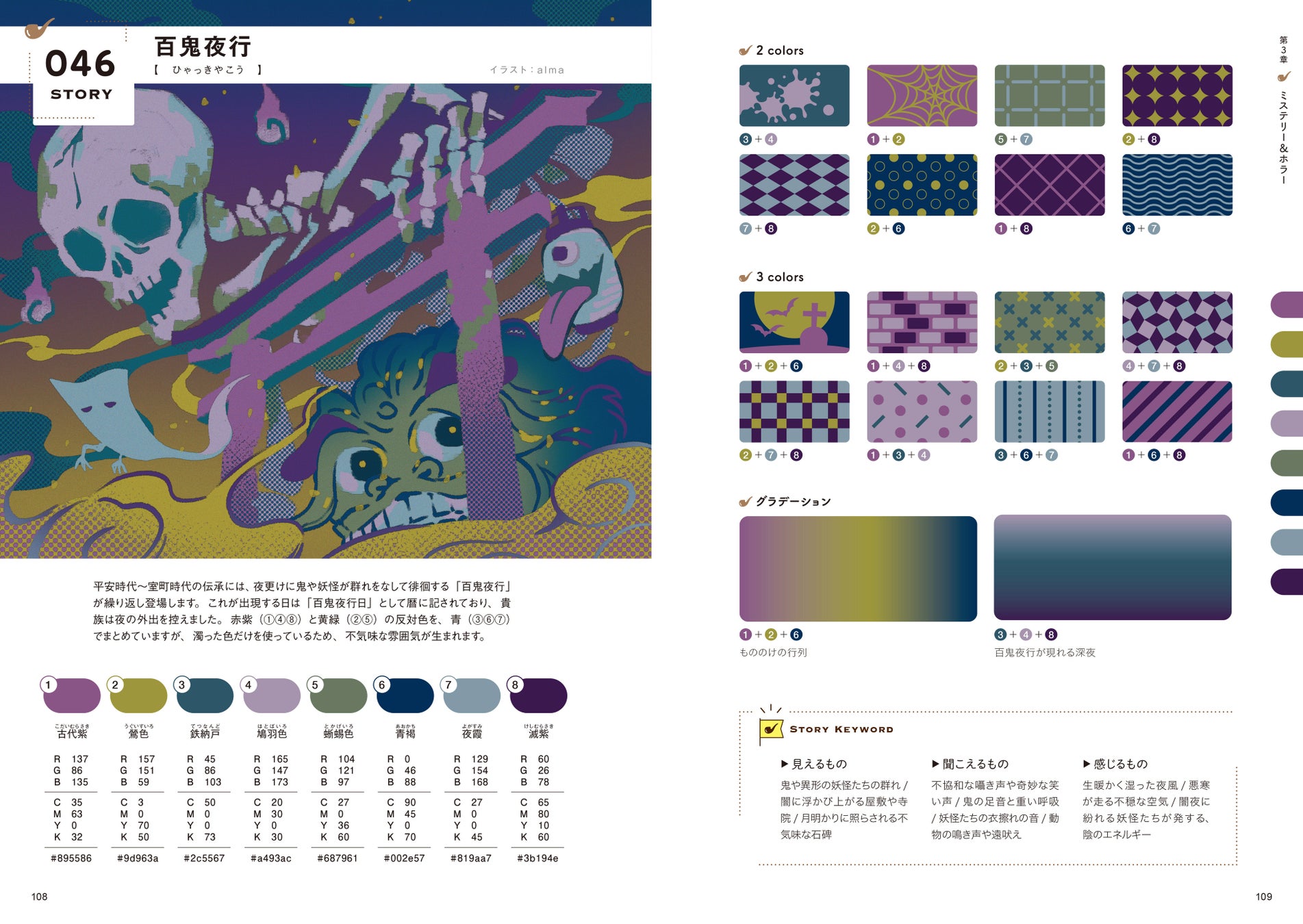 紹介している配色は、全てのCMYK・RGB・カラーコードを掲載しているので、イラストや漫画、ゲーム、アニメやMVなどビジュアルアートに活用しやすいです。