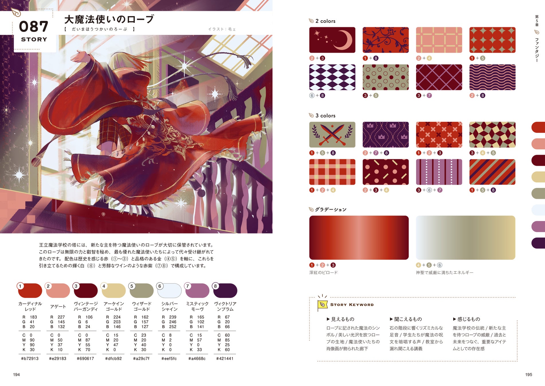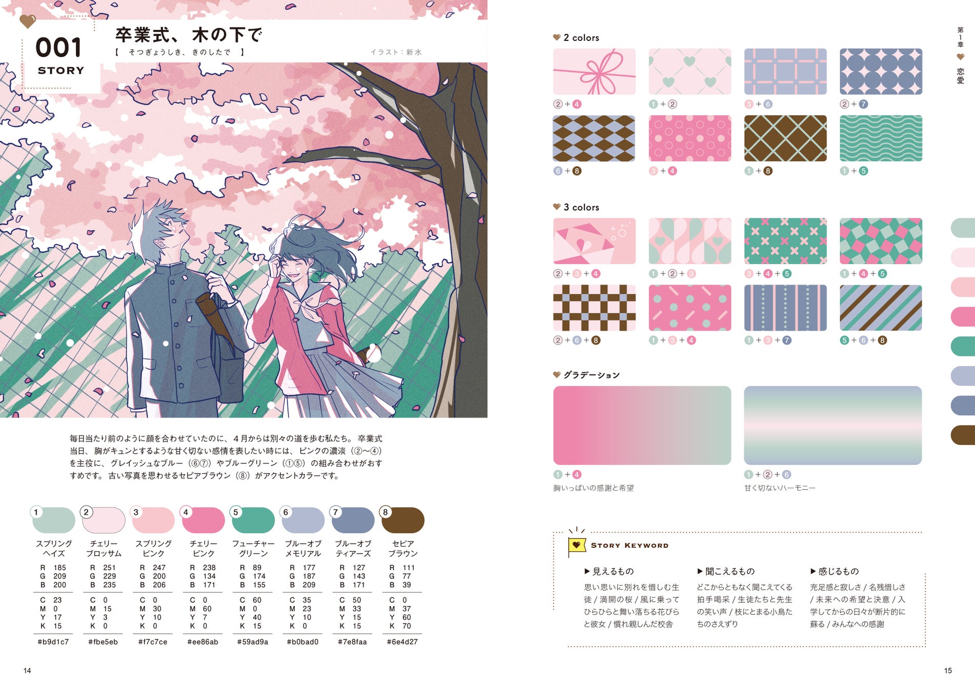 「恋愛」「青春」「ミステリー・ホラー」「SF」「ファンタジー」「歴史・時代」の合計6つの章で構成し、様々なストーリーテーマから配色アイデアを知ることができ、ページをめくるたびに、創作意欲が湧くように構成しています。
