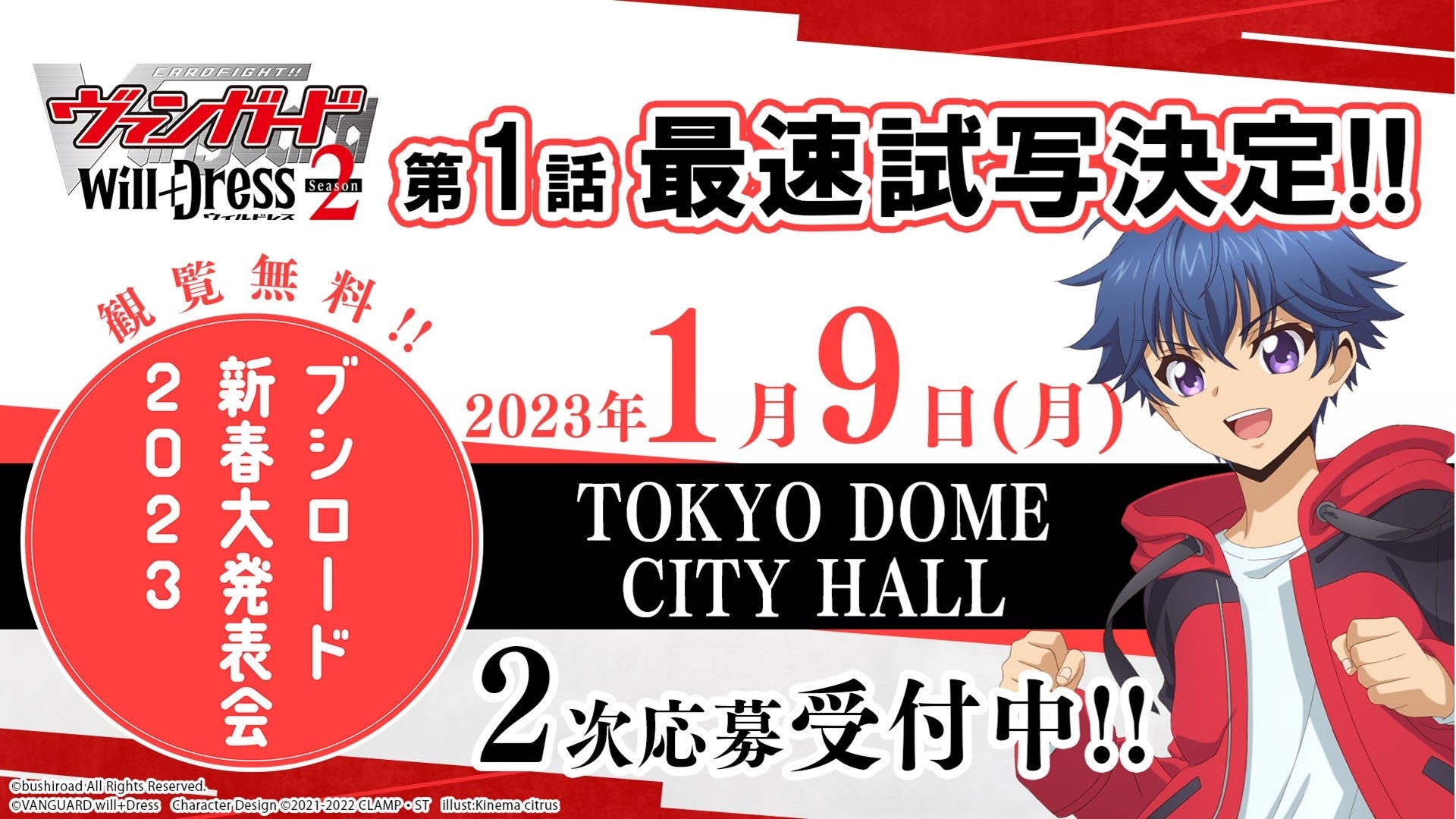 - 2023年1月9日(月)「ブシロード新春大発表会 2023」にて、 『カードファイト!! ヴァンガード will+Dress Season2』 第1話 最速試写決定!!