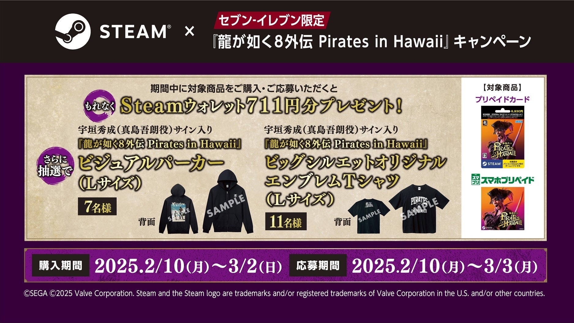 株式会社セガは、2025年2月21日(金)発売予定の『龍が如く8外伝 Pirates in Hawaii』(以下、『龍が如く8外伝』)について、2月10日(月)から3月2日(日)までの期間中、全国のセブン‐イレブン店舗にてSteamダウンロードカードを購入いただいた方全員に、Steamウォレットコード711円分をプレゼントするキャンペーンを開催します。