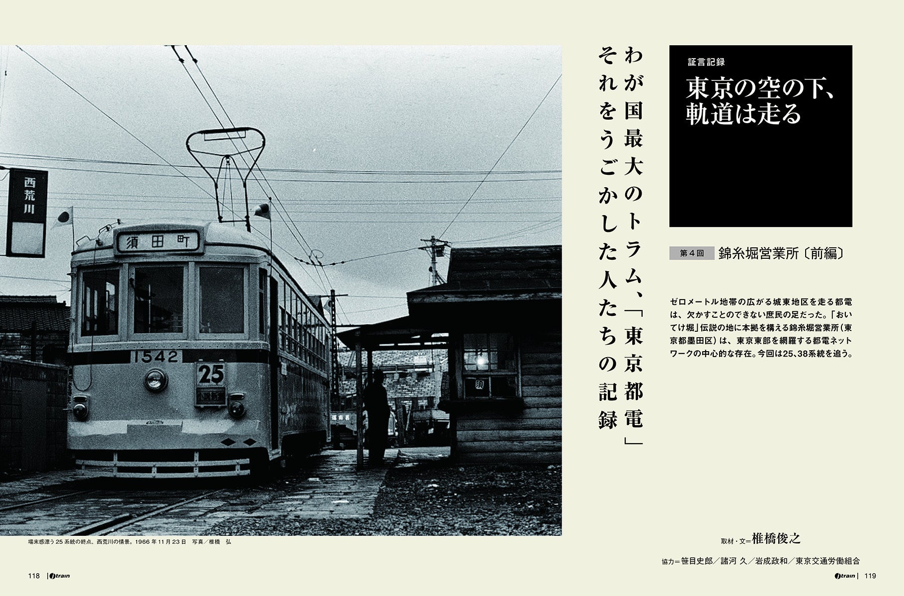 関係者の取材により、ありし日の東京都電の姿を浮き彫りにする「証言記録」。今号では錦糸堀営業所〔前編〕として、下町を闊歩した25・38系統の歴史、知られるエピソードを収録。都電の姿はもちろん、半世紀前の東京の街並みも必見です。