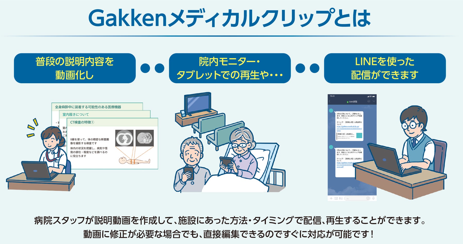 株式会社学研メディカルサポートでは、これまで医療・介護従事者向けの研修等でご利用いただけるe-ラーニングサービスを提供してまいりました。医療・介護従事者の皆様から、患者への説明業務がスタッフの方の大きな負担になっているというお話をよく伺うことから、このたび新たに、患者とその家族向けの説明動画作成・配信システム「Gakkenメディカルクリップ」を2024年8月にリリースします。