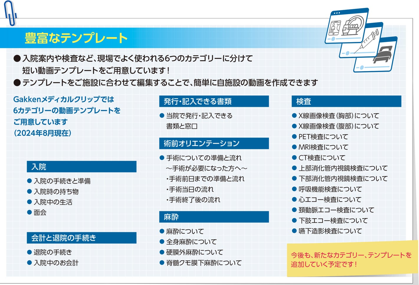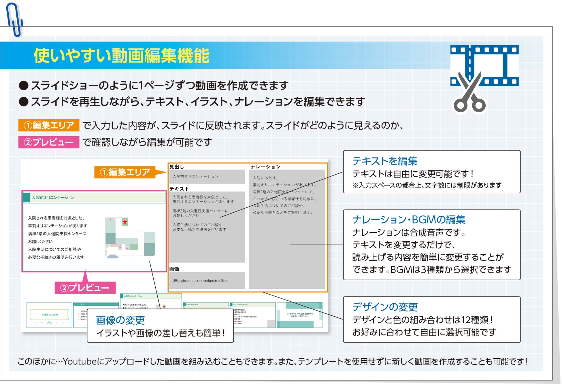 患者やその家族への説明で使う動画を施設側で簡単に作成できるよう、入院案内や検査、会計や退院などのテンプレートを6カテゴリー・28種(2024年8月現在)準備し、Webブラウザ上で編集できる機能を備えています。