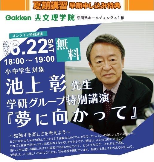 株式会社 学研ホールディングス(東京・品川/代表取締役社長:宮原博昭)のグループ会社、株式会社文理学院(山梨・都留/代表取締役社長:小倉勤)は、7月19日(金)~8月24日(土)期間に夏期講習を開催します。また、参加特典として「池上彰先生特別講演(6/22)」、「3776オープン模試(7/6)」、「世界遺産クイズフェス(7/6)」、「世界遺産講座(7/20~8/18)」があります。さらに、今年は「お友だち紹介キャンペーン」も行っています。