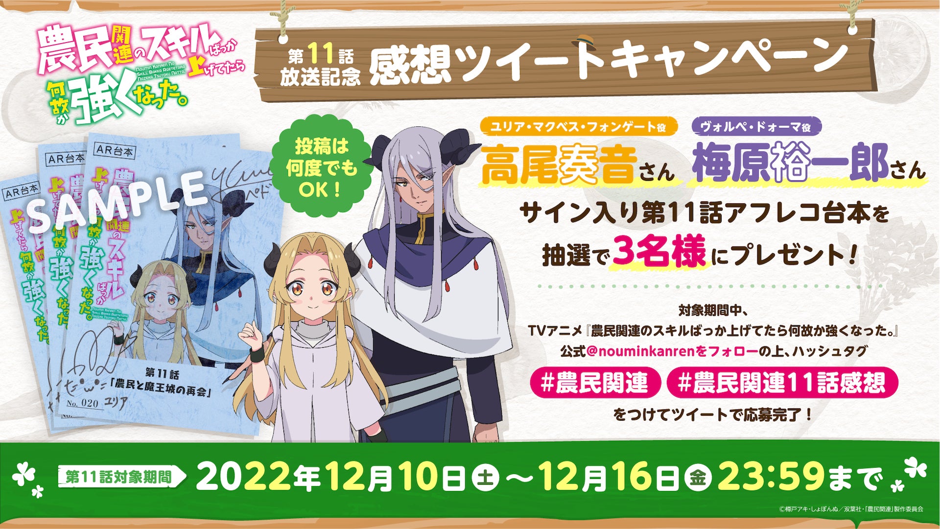 - TVアニメ『農民関連のスキルばっか上げてたら何故か強くなった。』 第11話放送記念 感想ツイートキャンペーン