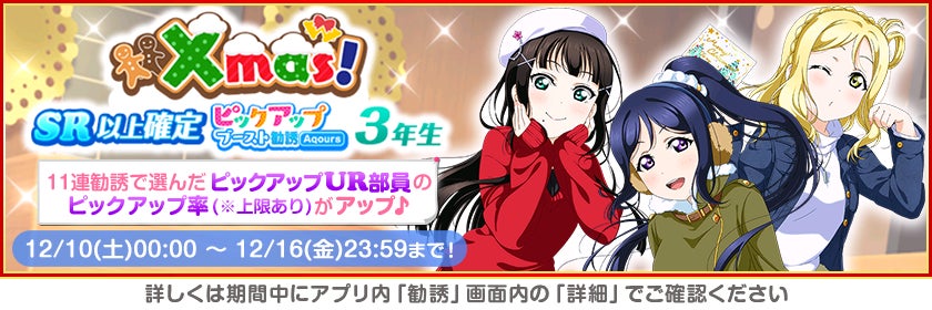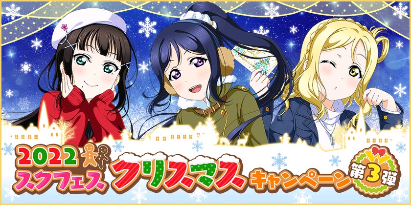 株式会社ブシロード(本社:東京都中野区、代表取締役社長:木谷高明)は、KLab株式会社(本社:東京都港区、代表取締役社長:森田英克)と共同開発いたしましたスマートフォン向けアプリ『ラブライブ!スクールアイドルフェスティバル』(以下、スクフェス) において2022スクフェスクリスマスキャンペーン第3弾の開催をお知らせいたします。