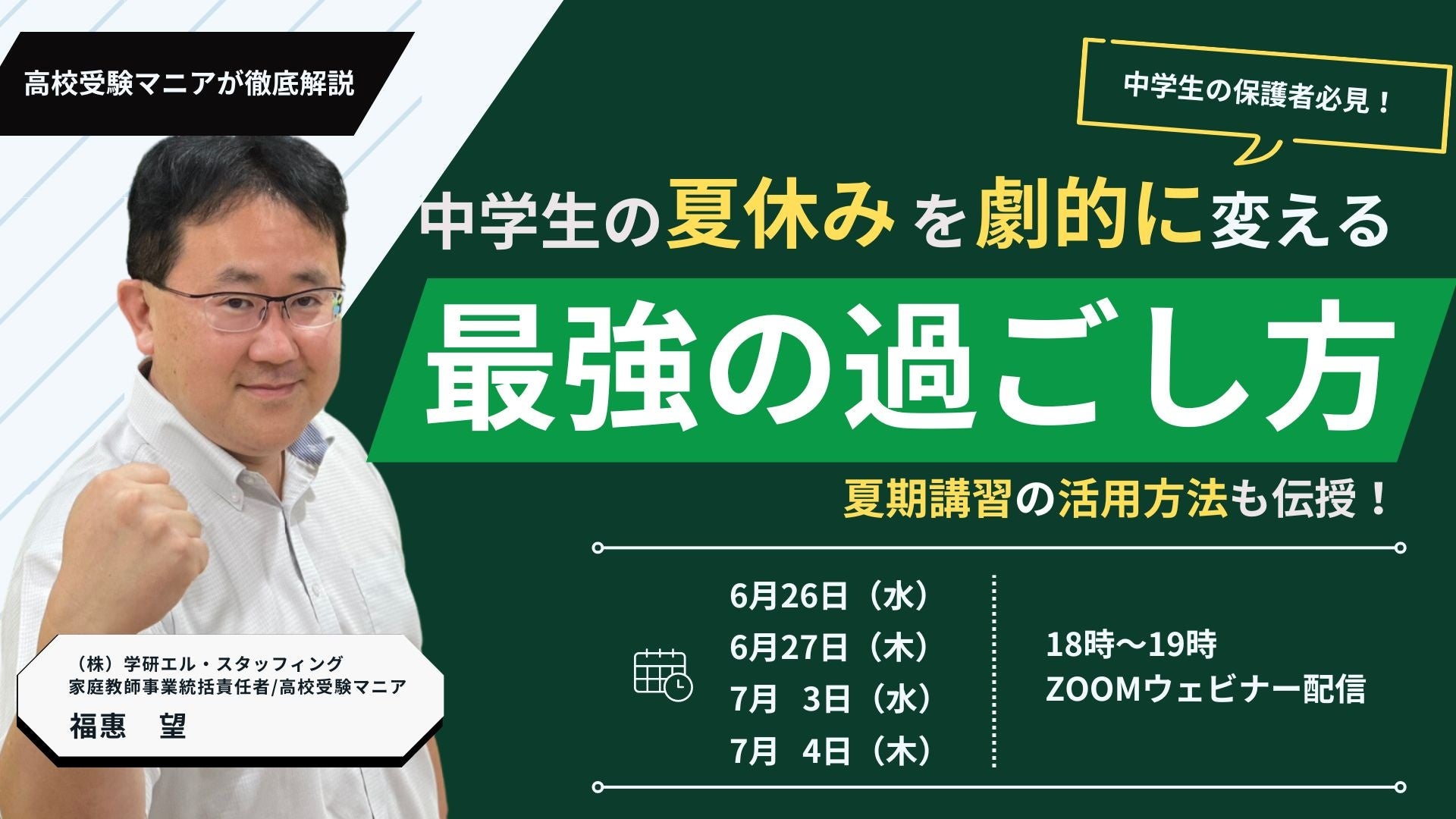 学研の家庭教師が、【中学生の夏休みを劇的に変える最強の過ごし方セミナー】を6月26日(水)、6月27日(木)、7月3日(水)、7月4日(木)に開催します!