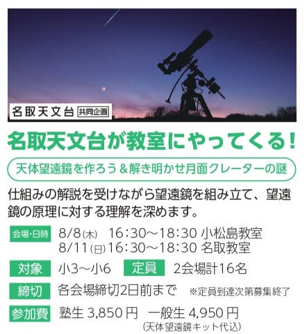 【宮城県のあすなろ学院×名取天文台】小学3年生~小学6年生対象特別講座「名取天文台が教室にやってくる! 天体望遠鏡を作ろう&月面クレーターの謎」8/8(木)、8/11(日)開催!