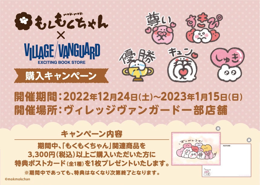 12月24日(土)より、ゆる~く可愛い「もくもくちゃん」とヴィレッジヴァンガードの購入キャンペーンの実施が決定!新作商品が多数登場!