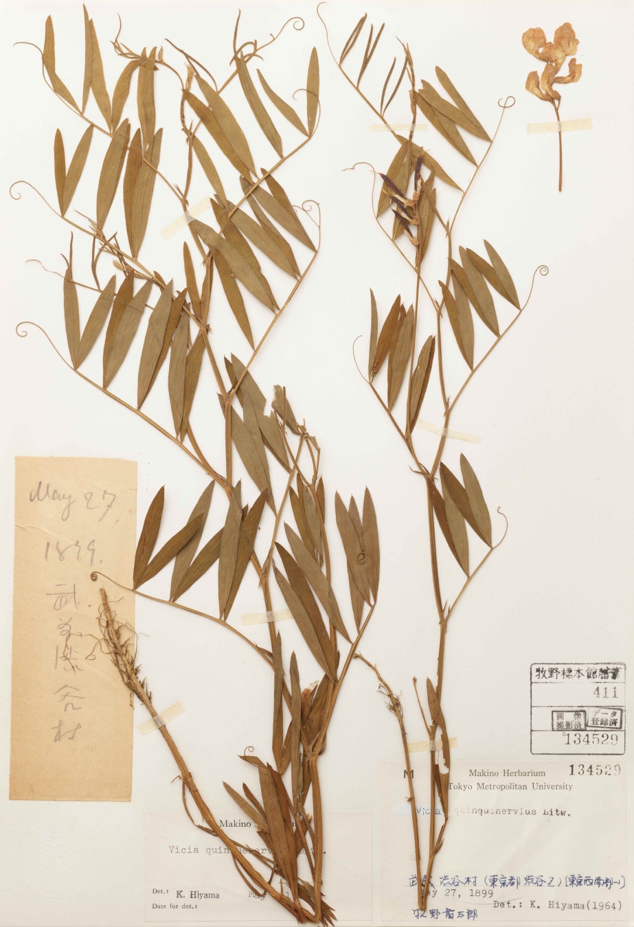 ◀1899年渋谷で採集された「レンリソウ」の標本(東京都立大学牧野標本館所蔵)