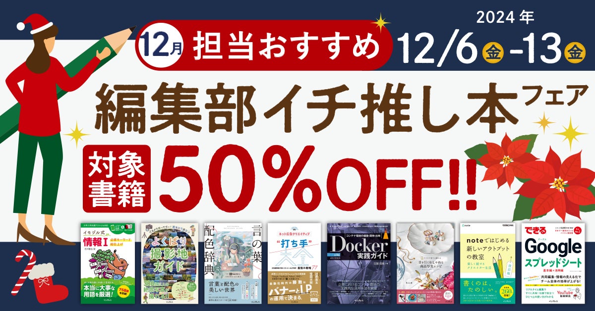インプレスグループでIT関連メディア事業を展開する株式会社インプレス(本社:東京都千代田区、代表取締役社長:高橋隆志)は、対象の電子書籍が50%オフで購入できる「担当おすすめ!編集部イチ推し本フェア 2024年12月」を2024年12月6日(金)から12月13日(金)まで実施いたします。