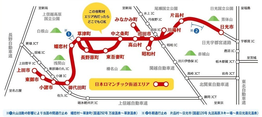 上田市・東御市・小諸市・御代田町・嬬恋村・長野原町・草津町・東吾妻町・中之条町・高山村・沼田市・みなかみ町・川場村・昭和村・片品村・日光市の各スポット(全16スポット)