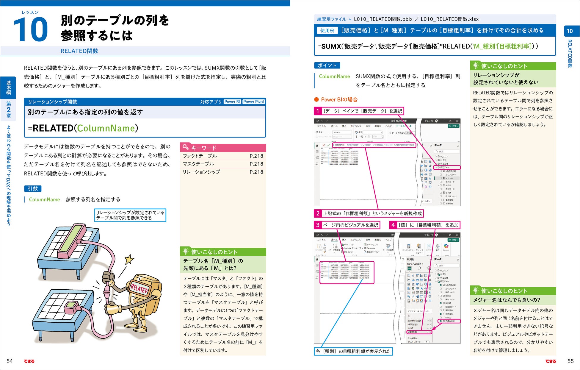 基本編と活用編の二部構成となっており、基本編ではDAX関数の基礎知識や最初に覚えておきたい関数を解説しています。活用編では時系列の分析、テーブルの操作など、目的ごとに章を分けて、各関数をリファレンス形式で解説しています。引数の概要やDAX関数の使用例など、関数を使うにあたっての情報をさまざまな角度から紹介しているため、実務に応用して使いこなせるようになります。