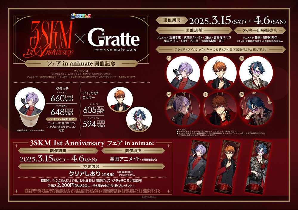 さらに、フェアと同期間中、アニメイト一部店舗では「にじさんじ 3SKM 1st Anniversary フェア in animate開催記念×Gratte」を開催いたします。ドリンクの上のクリームにビジュアルをプリントしたグラフィックラテ“グラッテ”&アイシングクッキーをお楽しみいただけますので、こちらもお見逃しなく!