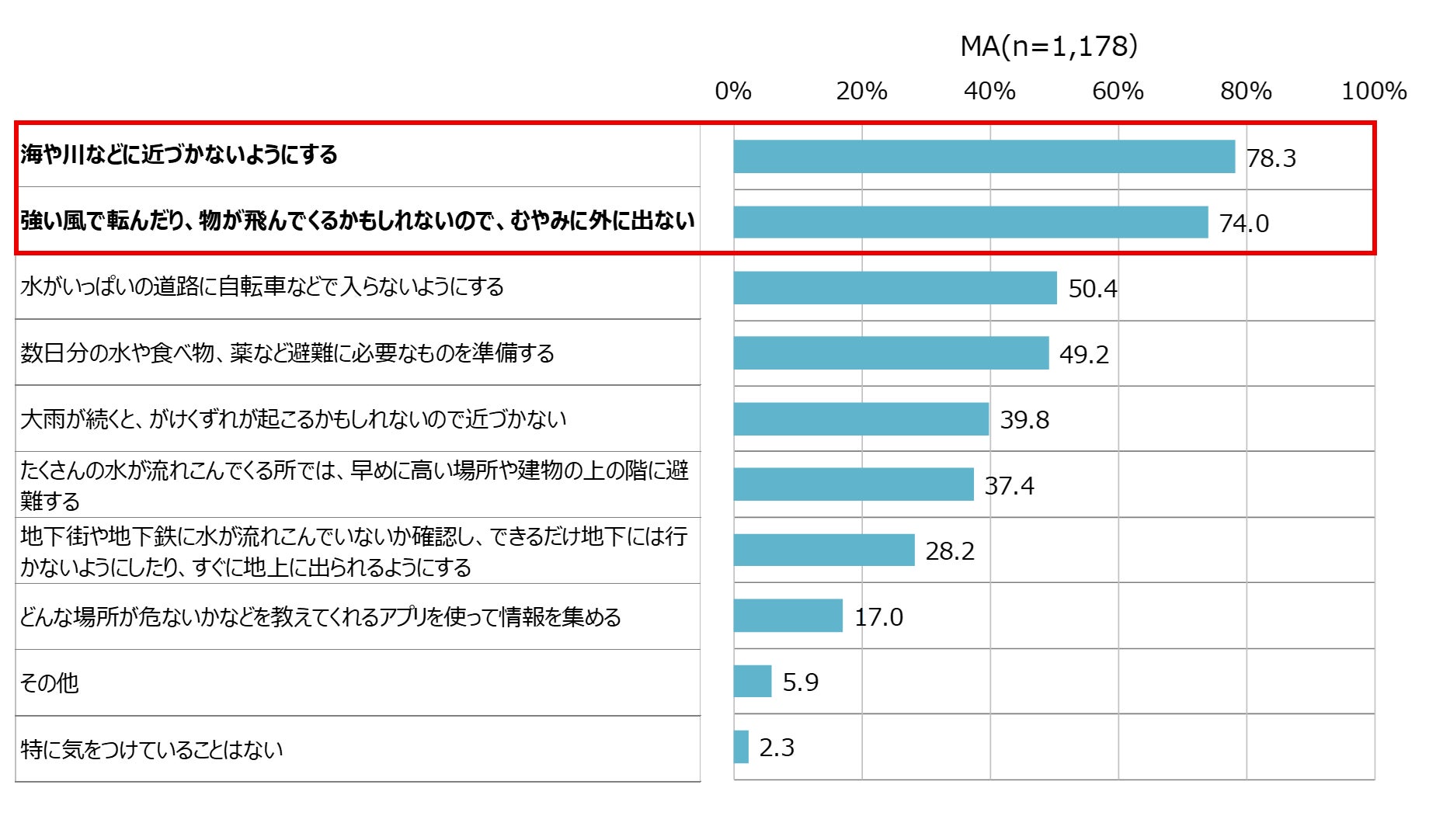 あなた自身、もしくはお家の人と一緒に、台風や大雨の日にどんなことに気を付けていますか。
