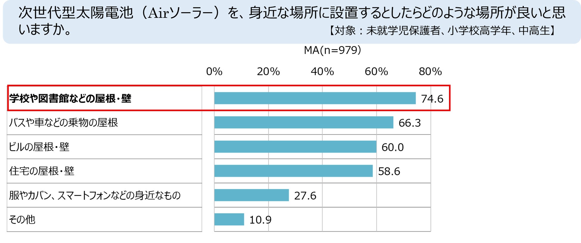 次世代型太陽電池(Airソーラー)を、身近な場所に設置するとしたらどのような場所が良いと思いますか。 【対象:未就学児保護者、小学校高学年、中高生】