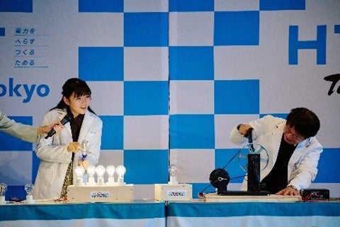 イベント当日は、HTT(電力をⒽへらす・Ⓣつくる・Ⓣためる)の取り組みをテーマに「見て・学んで・体験できる」プログラムを展開。ステージでは、HTT兄妹の堀越麗禾さんとサイエンスメッセンジャーのかず先生による「サイエンスショー」を展開し、地球温暖化によって引き起こされる大雨のしくみ、電気をつくる仕組み、再生可能エネルギーの種類などについて“楽しく学べる”実験パフォーマンスを披露しました。
