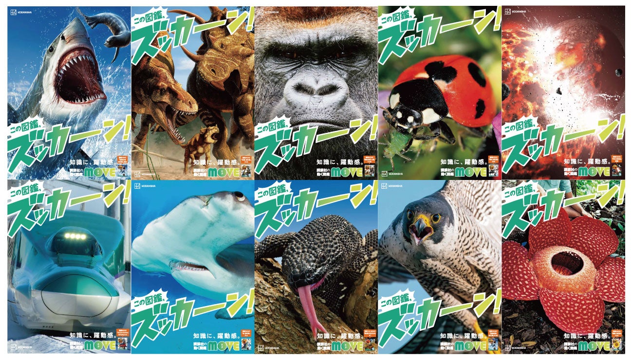 2024年夏の図鑑フェアでは、子どもたちがMOVEのページを開いたときの驚きを表現すべく、各ジャンルの印象的なビジュアルを選定。大胆なアングル&デザインでMOVEらしさを表現する新クリエイティブが完成しました。ビジュアルが目の前に迫りくる様子、心に響くイメージを「ズッカーン!」というロゴとともにお届けします。全10種のバリエーションポスターを始め、書店販促品や大型パネル、ビジョンなどを続々と展開しますので、ぜひお近くの書店やMOVE公式WEBサイトなどでご覧ください!