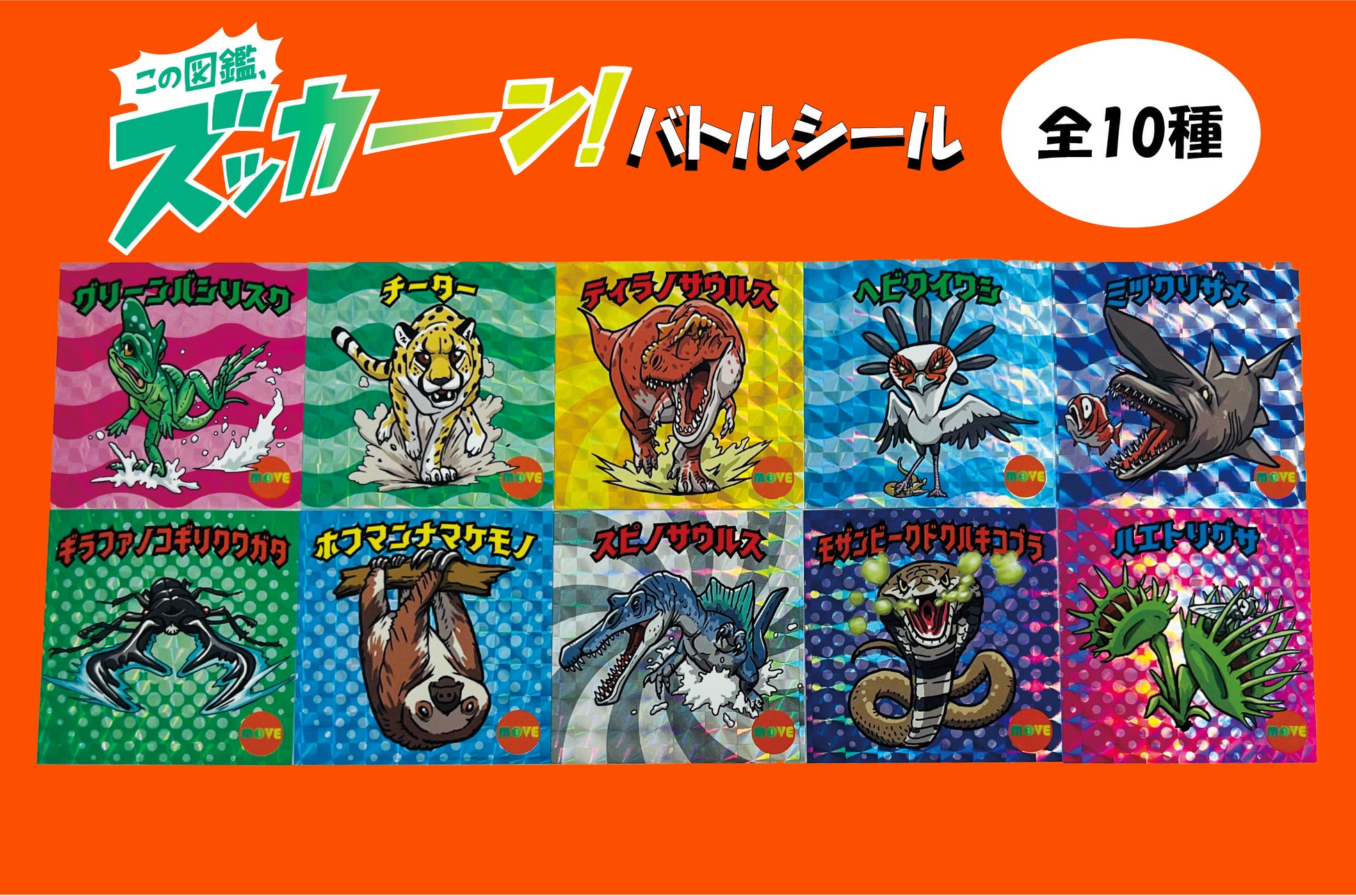 ズッカーン夏フェア中にMOVEをお買い上げいただくと、1冊につき1枚、MOVEオリジナルのキラキラ“ズッカーン バトルシール”がついてます※。今回モチーフとなった生物は、ティラノサウルス・スピノサウルス・ミツクリザメ・ヘビクイワシ・グリーンバシリスク・ホフマンナマケモノ・モザンビークドクハキコブラ・ギラファノコギリクワガタ・ハエトリグサの10種。ユーモアあふれる描き下ろしデザインでキラキラのカラフルホログラムに仕上げました♪