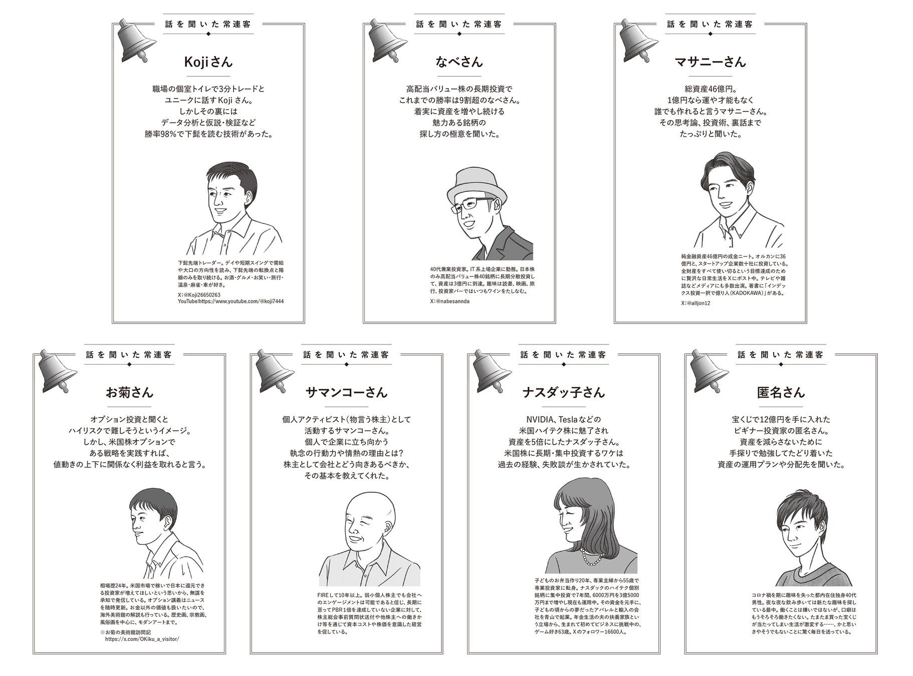 本文は常連投資家と主人公の会話形式で進み、バーで会話しているようなラフな雰囲気で読みやすくまとまっています。また常連投資家7人は、それぞれが個性的で異なる投資スタイルを持った人物。それぞれの成功体験、失敗談、そして投資哲学を惜しみなく語っています。投資初心者だけでなく、上級者でも新たな投資の手段や、経験したことのない世界について学べる役立つヒントが多く書かれています。