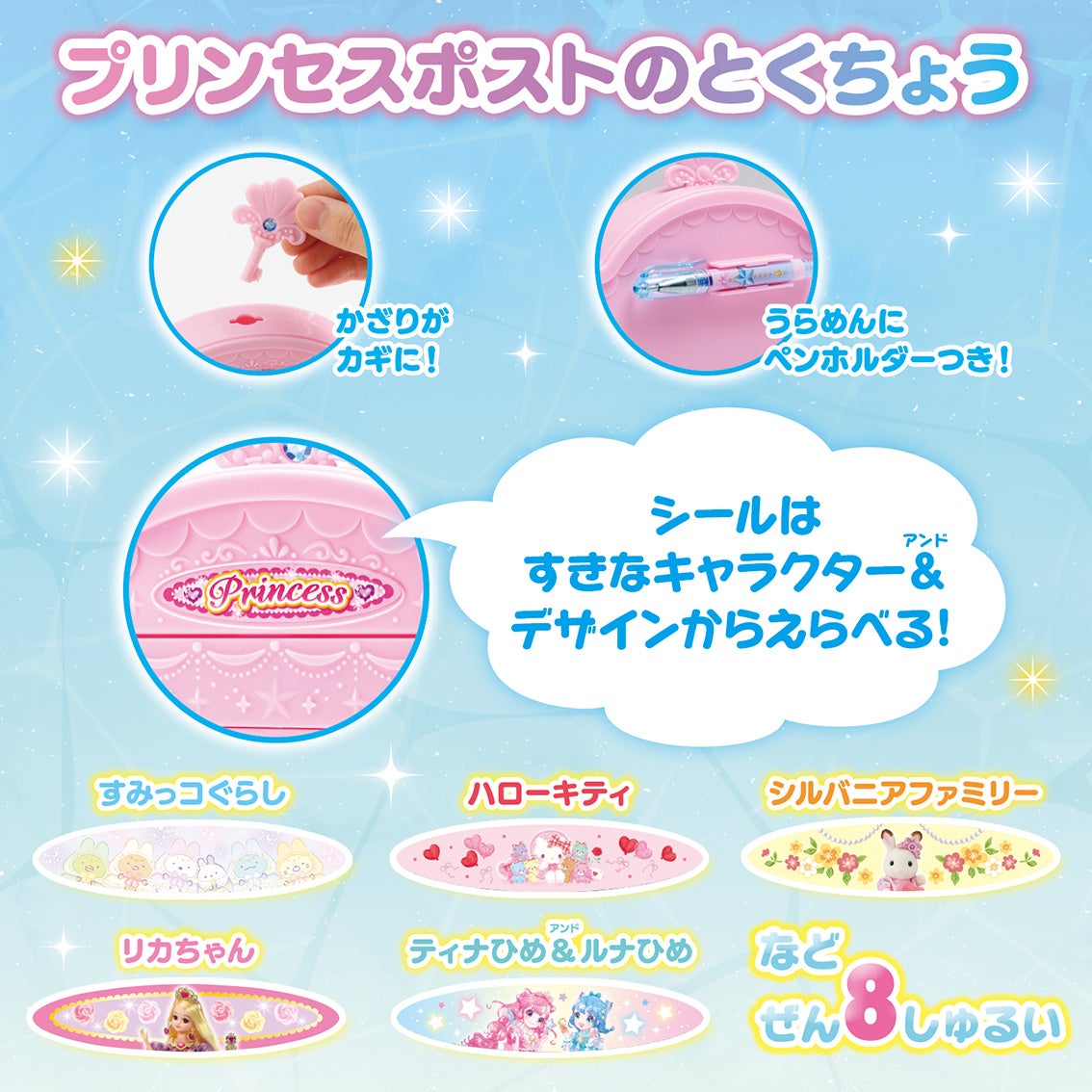プリンセスポストには、楽しいポイントがいっぱい! ポストの上のかざりを引き出すとカギに変身! カギ穴にさせば、ポストを開けることができます。また、ポストのうらには、おてがみペンをしまえるペンホルダー付きです。さらに、投函口の上をシールでデコれちゃう♥ すみっコぐらし、ハローキティなどの人気キャラクターやおしゃれなロゴから、好きなデザインを選んで、あなただけのポストを完成させてね♪