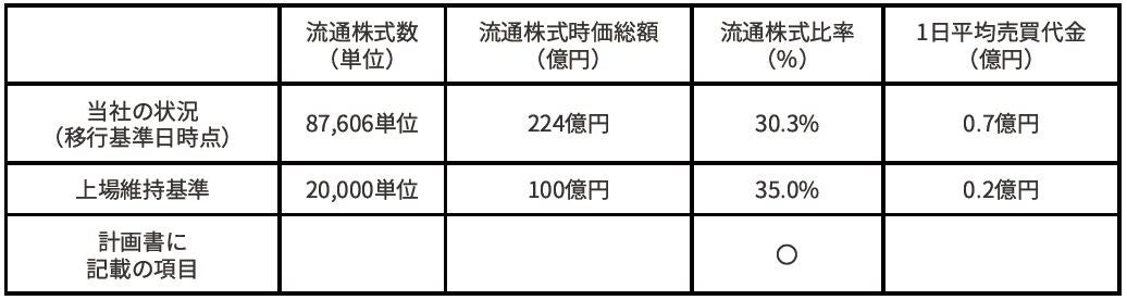 当社の移⾏基準日時点におけるプライム市場の上場維持基準への適合状況は、以下のとおりとなっており流通株式比率については基準を充たしておりません。当社は、流通株式比率に関しては2021年12月末までに上場維持基準を充たす各種取組みを進めております。