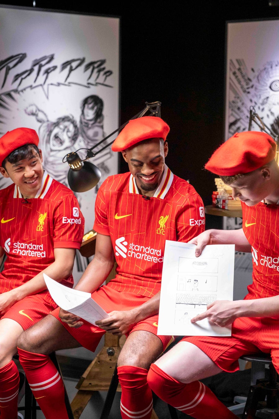 選手たちが制作した4コマ漫画は、リバプールFCの大ファンでもある『蒼く染めろ』漫画家の桜井ミヤトさんにバトンタッチされました。桜井さんは担当の編集者とともにプロセスを説明しながら、選手たちのコンセプトを融合した新たな4コマ漫画を完成させました。動画では、桜井さんがリバプールFCへの熱いエールを込め、細部にわたって丁寧に作り上げる制作の過程が捉えられています。この貴重な動画では、下書きからペン入れまでのプロセスを通じて、プロの漫画家がどのように作品を創り上げるかを間近で見ることができます。