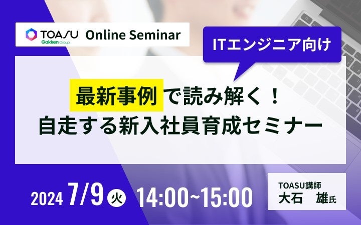 株式会社 学研ホールディングス(東京・品川/代表取締役社長:宮原博昭)のグループ会社、株式会社TOASU(東京・品川/代表取締役社長:宮田 晃)は、2024年7月9日(火)に、「“ITエンジニア向け” 最新事例で読み解く!自走する新入社員育成セミナー」を実施いたします。