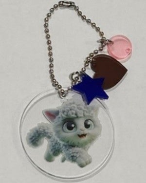 キャラクターが印刷されたアクリル板に、チェーンやチャームの飾りを取り付けてキーホルダーを完成させます。