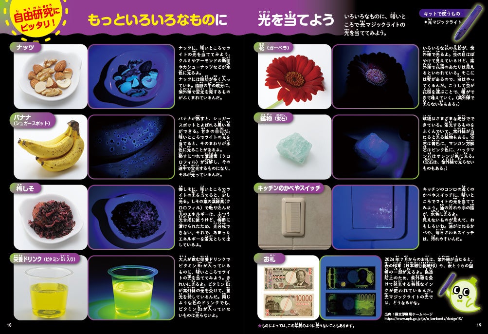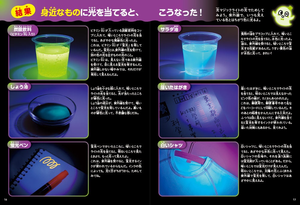 サラダ油、しょう油、ビタミンB2入りの炭酸飲料、届いたはがき、ナッツ、バナナ、壁の汚れ、お札…。いろいろなものに、暗いところで光マジックライトの光を当ててみましょう。美しく黄緑色に光ったり、水色や緑色に光ったり。届いたはがきには、見えなかったバーコードがピンク色であらわれます。キッチンの壁などの油汚れは、水色に光ります。ガイドブックには、なぜそうなるかの解説もあり、おとなも知らないことがいっぱい! かんたんに実験できて、すぐに結果が出るので、自由研究にピッタリです!