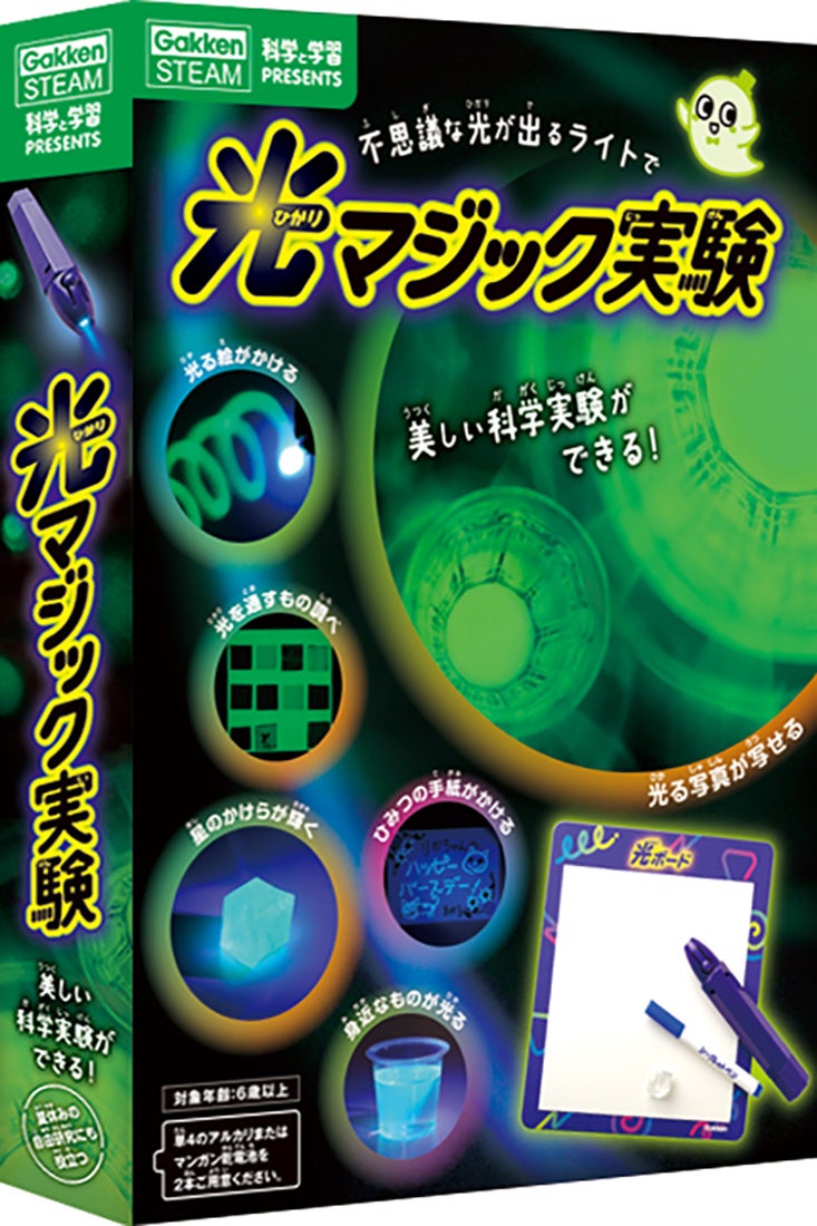 『科学と学習PRESENTS 光マジック実験』は、美しい科学実験がかんたんにすぐできるキットです。ガイドブックには、子どもが大好きな「暗闇で光る実験」がいっぱい! 紫外線のいろいろな実験もできて、自由研究にも役立ちます。