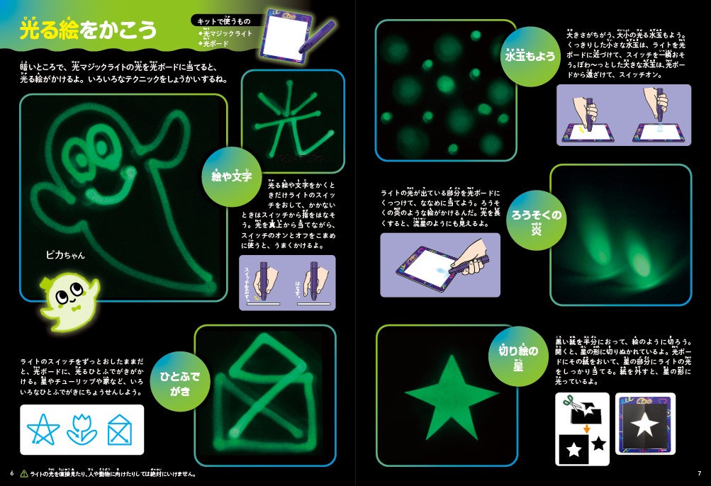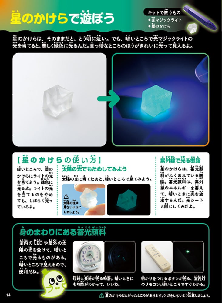 ●光マジックライト(光生物学的安全性の評価試験で人体(網膜)への安全性を確認済み)/●光ボード(15cm×15cmの蓄光シート付き)/●ミラクルペン(光であらわれる不思議なインクのペン)/●星のかけら(蓄光樹脂)/●ガイドブック(20ページ)が入っています。