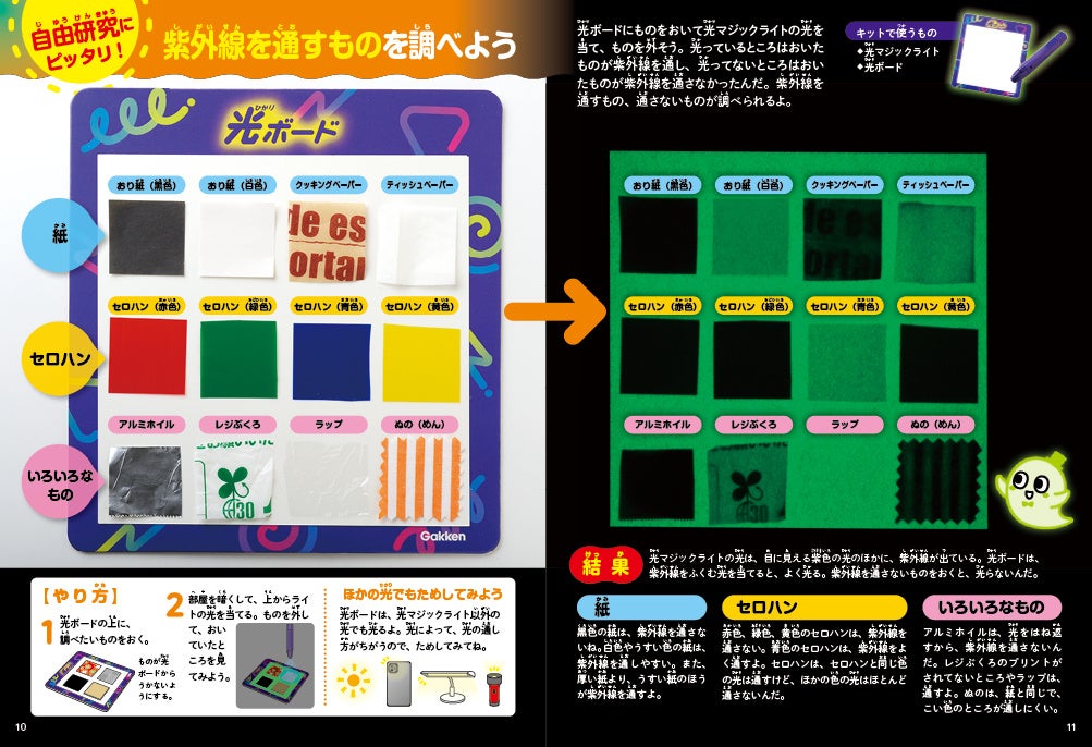光マジックライトの光は、紫外線を含む光。紙や布などいろいろなものを光ボードの上において、暗いところで光マジックライトの光を当てると…。光ボードの光具合で、紫外線を通すものと通さないものが調べられます。すぐに結果が出るので、かんたんに自由研究ができます!