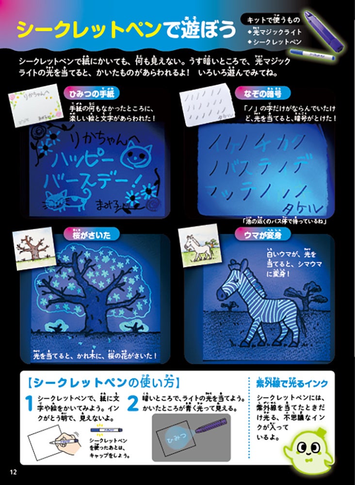シークレットペンは、紙にかいても何も見えない。でも、うす暗いところで光マジックライトの光を当てると、かいたものがあらわれる不思議なペンです。ひみつの手紙やなぞの暗号、絵がわりなど、いろいろ楽しく遊べます。家族やお友だちをびっくりさせましょう。