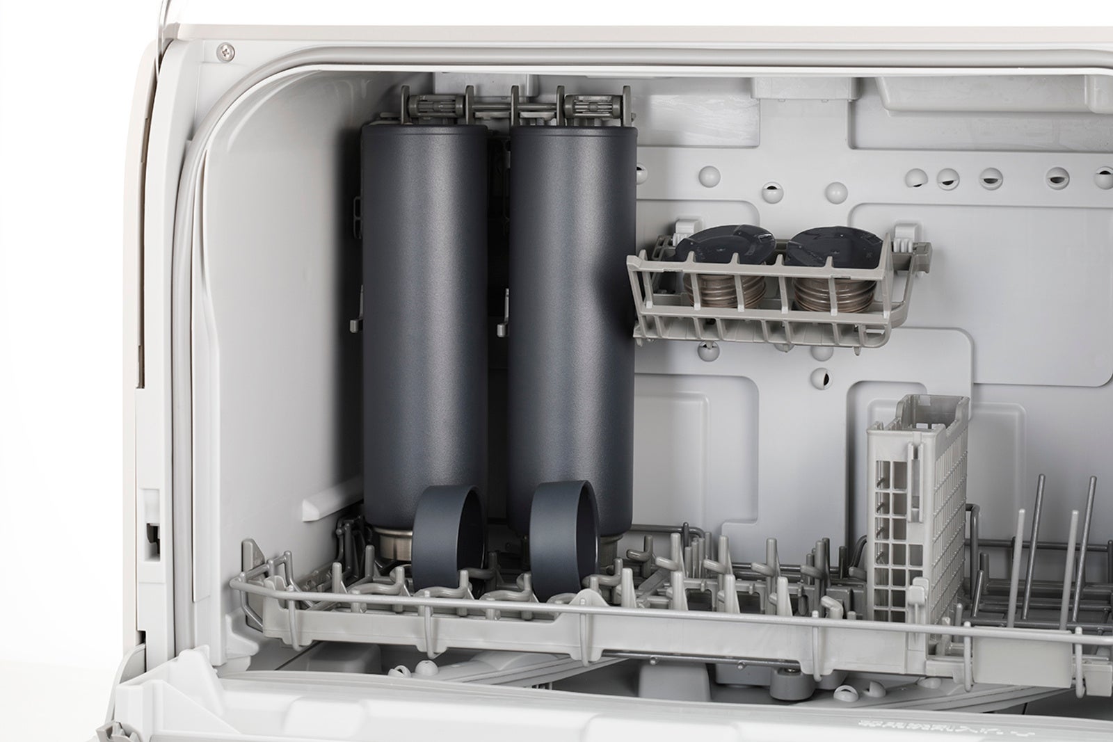 さらに下かごは食器の形をイメージさせるような丸みを帯びた形状を採用し、食器の向きがわかりやすい仕様にしました。庫内奥には食洗機対応マイボトルや口の広いタンブラーもセット可能な「タンブラー&ボトルホルダー」を搭載。2人分のマイボトルが洗浄できます。