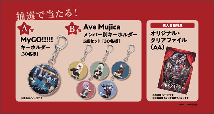フェア対象商品ご購入で『Ave Mujica オリジナル・クリアファイル(A4)』を贈呈。さらに、レシートorはがきの応募で抽選でオリジナル・キーホルダーをプレゼント!