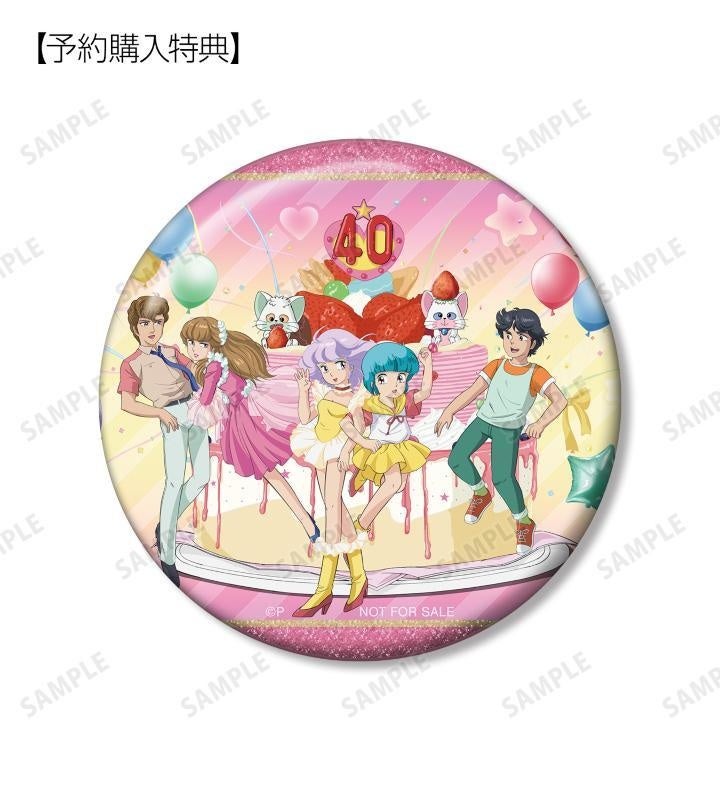 40周年のロゴ、クリィミーマミ、森沢 優、ネガ、ポジのイラストをグリッター加工を施した缶バッジに仕上げました。