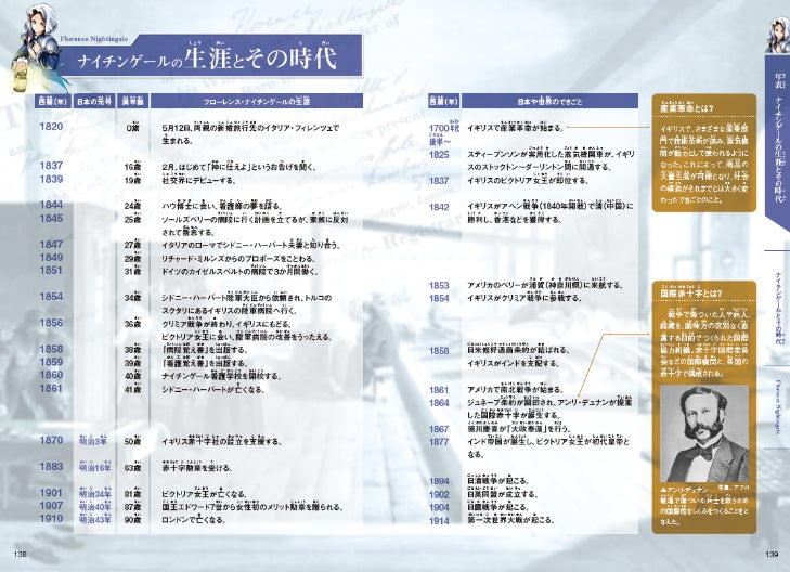 本書は全編オールカラー。まんがはもちろん、巻末の資料ページも充実しています。年表やキーワード、名言など、さまざまな角度からナイチンゲールについて理解を深めることができます。