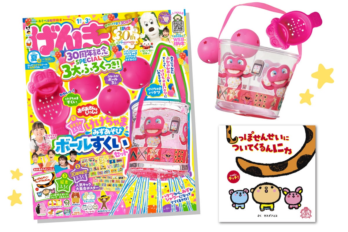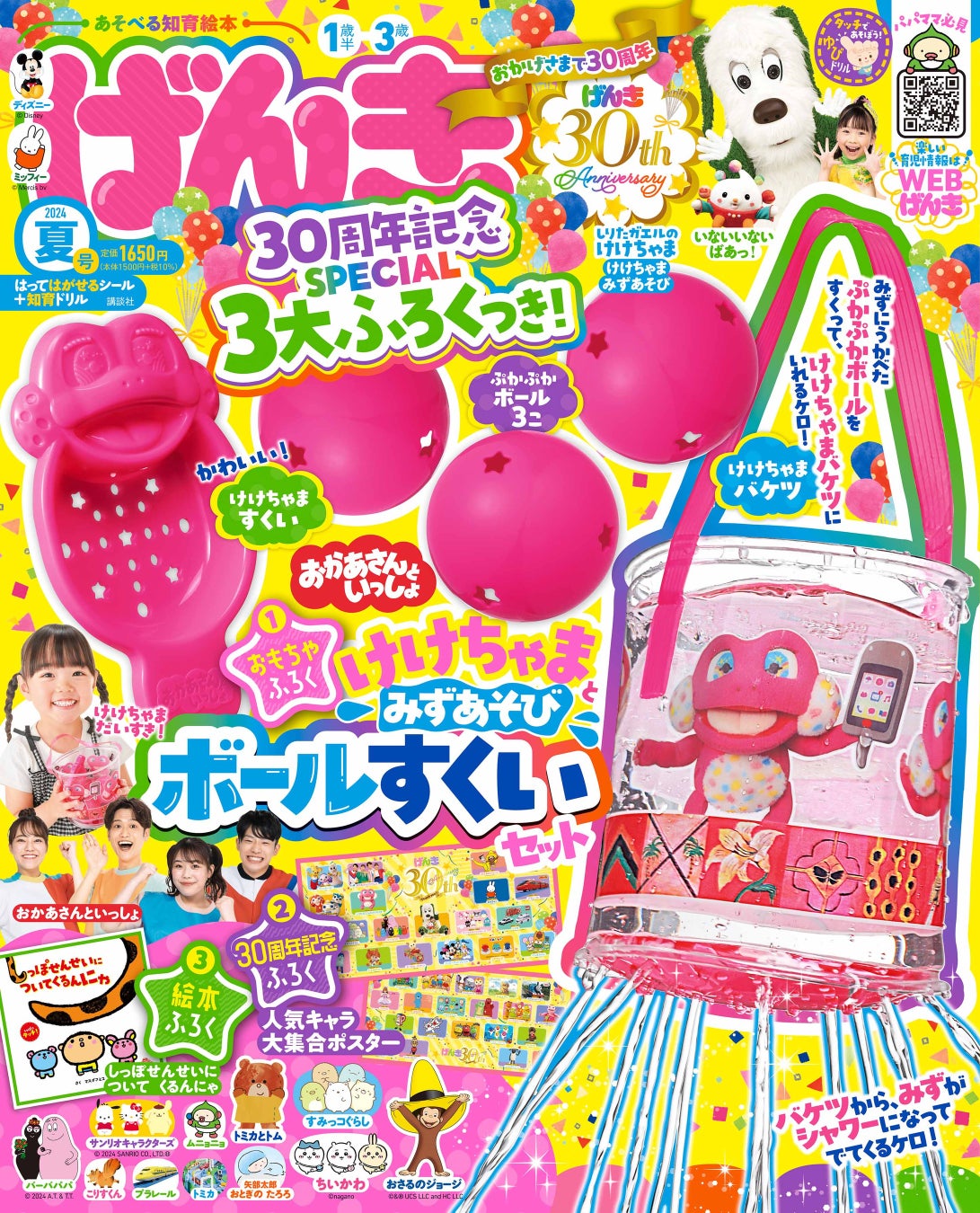 1歳半からの雑誌「げんき」創刊30周年! 夏号は「けけちゃまとみずあそび ボールすくいセット」など3大ふろくつき! なつかしの、あのキャラクターも登場!