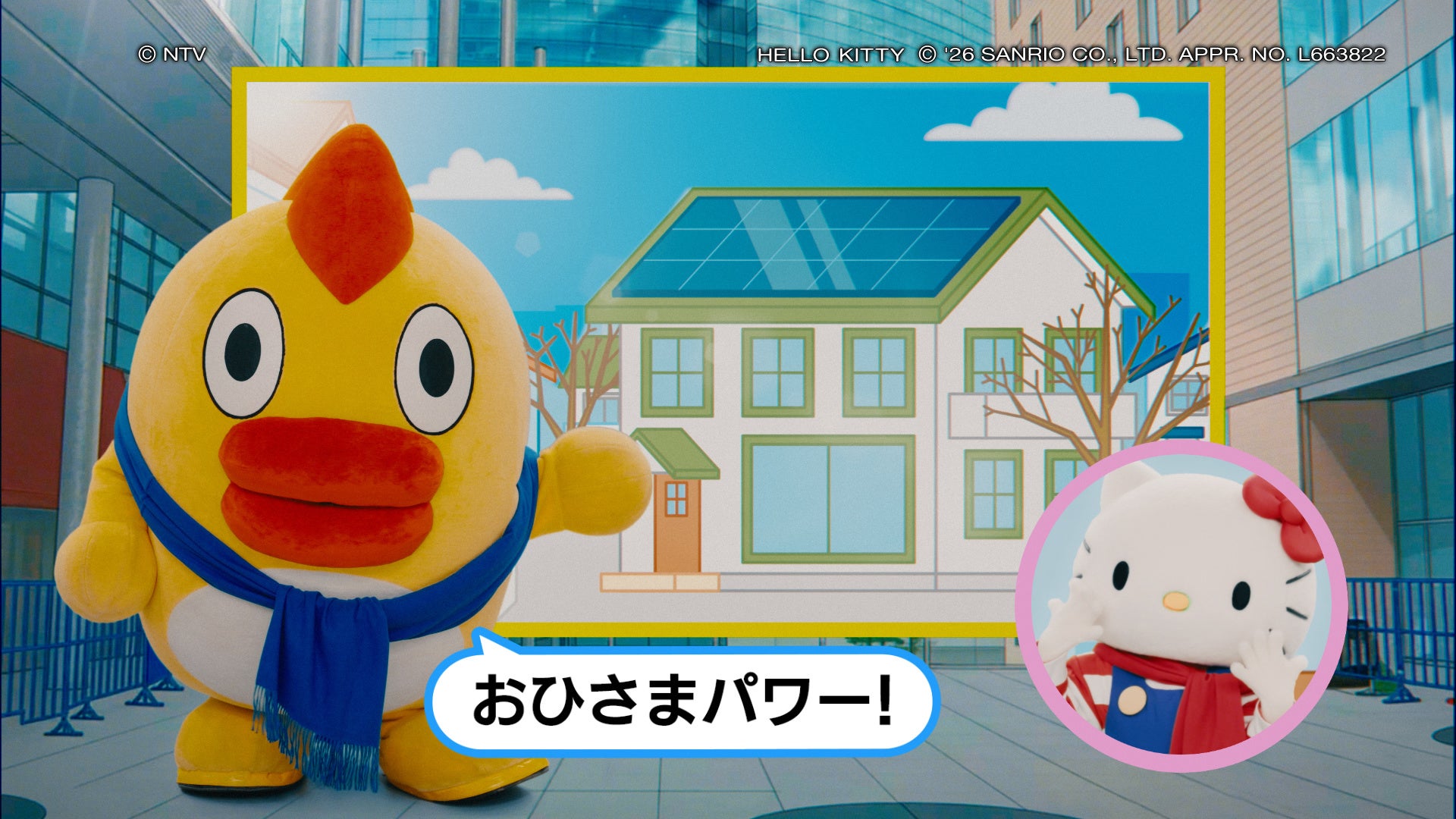 (太陽光発電の経済・防災面のメリットをそらジローが説明し、ハローキティが「ここちよい暮らし」の実現を呼びかける)