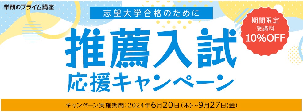 株式会社 学研ホールディングス(東京都品川区/代表取締役社長:宮原博昭)のグループ会社、株式会社 Gakken(東京都品川区/代表取締役社長:五郎丸徹)は、2024年6月20日(木)よりオンライン映像講座「学研のプライム講座」において、夏期限定の「推薦入試応援キャンペーン」をスタートいたしました。本キャンペーンでは、学校型選抜または総合型選抜で大学入学を目指す受験生に向けて、推薦入試対策のオンライン映像講座「学研推薦・総合型選抜ゼミ」をはじめ、小論文など推薦入試対策の講座を10%OFFの特別価格にて提供いたします。