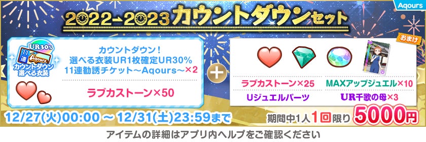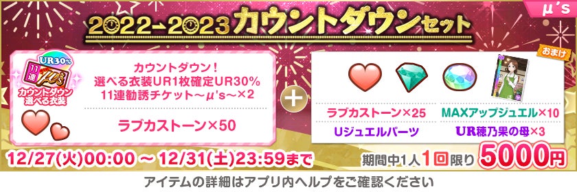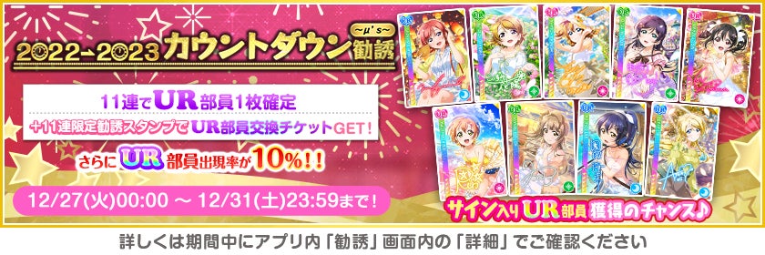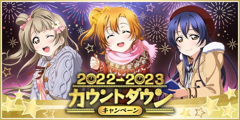 株式会社ブシロード(本社:東京都中野区、代表取締役社長:木谷高明)は、KLab株式会社(本社:東京都港区、代表取締役社長:森田英克)と共同開発いたしましたスマートフォン向けアプリ『ラブライブ!スクールアイドルフェスティバル』(以下、スクフェス) において2022→2023カウントダウンキャンペーンの開催をお知らせいたします。